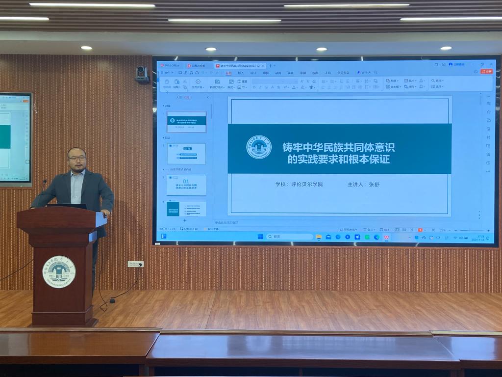 为深入学习贯彻党的二十届三中全会精神,进一步推动铸牢中华民族共同体意识走深走实,更好地履行举旗帜、聚民心、育新人、兴文化、展形象的使命任务,9月18日下午,万象城娱乐awc线路铸牢中华民族共同体意识教研室教师张舒、程欣、窦红伟三位教师受呼伦贝尔市民委和校宣传部委托进行了铸牢中华民族共同体意识主题宣讲。
