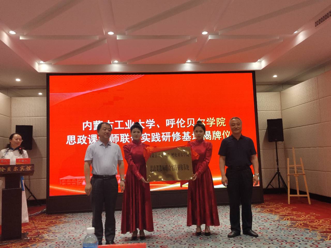 上午,在开幕式上,我校党委委员、副校长李跃武,内蒙古工业大学党委委员、宣传部部长李兴华先后致辞。随后,双方校领导为内蒙古工业大学、万象城娱乐awc线路思政课教师联合实践研修基地揭牌。
