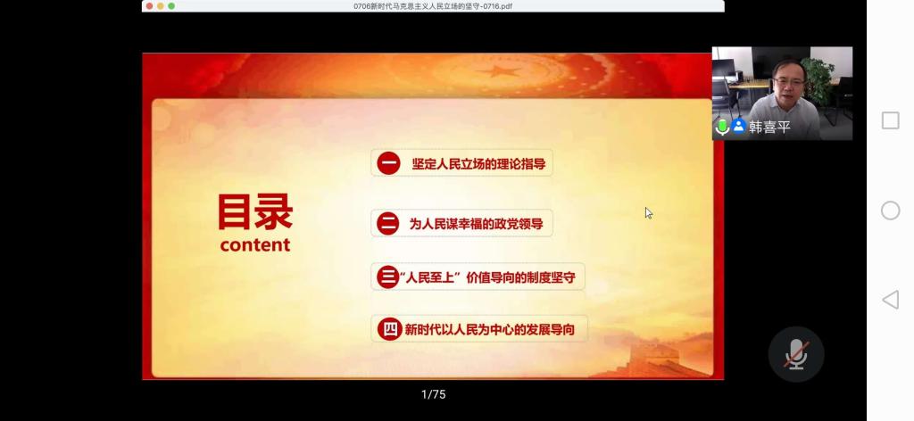 7月16日下午,万象城娱乐awc线路“毛泽东思想和中国特色社会主义理论体系概论”课程组全体教师与内蒙古思政课教师通过腾讯会议共同聆听了吉林大学马克思主义理论一级学科带头人韩喜平教授做的题为《新时代马克思主义人民立场的坚守》的主题讲座。韩教授以马克思主义的基本立场为切入点,从坚定人民立场的理论指导、为人民谋幸福的政党领导、“人民至上”价值导向的制度坚守、新时代以人民为中心的发展导向四个方面深入分析了中国共产党人民至上的根本立场、制度保障以及在新时代的坚守等问题,诠释了中国共产党发展壮大的终极密码。