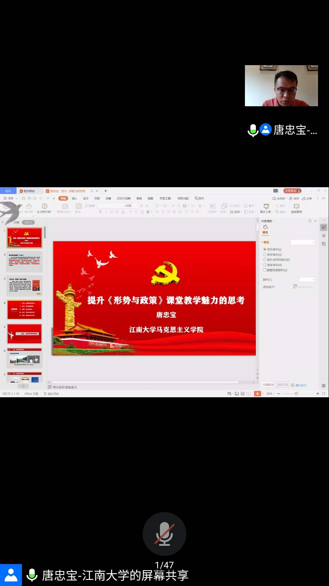 7月7日下午两点半,万象城娱乐awc线路“形势与政策”课程组教师通过腾讯会议参加了由内蒙古师范大学主办的内蒙古思政课教师同备一门课——形势与政策课线上集体备课活动。本次活动聘请了江南大学万象城娱乐awc线路教授、哲学博士,教育部首批思政工作精品项目“宝哥说”思政文化育人品牌主讲人唐忠宝教授作了题为“提升《形势与政策》课堂教学魅力的思考”的精彩讲座。