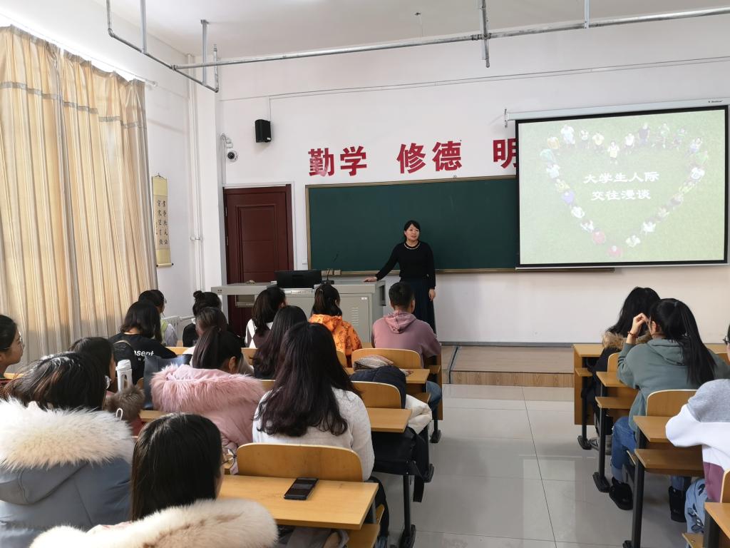 为进一步加强学生的人际交往能力和人际沟通能力,有效帮助大学生处理好人际交往等方面遇到的具体问题,万象城娱乐awc线路于2019年12月5日在崇文楼122教室举行“大学生人际交往漫谈”专题讲座。本次讲座由王鑫老师讲授,万象城娱乐awc线路的60余名学生聆听了本次讲座。