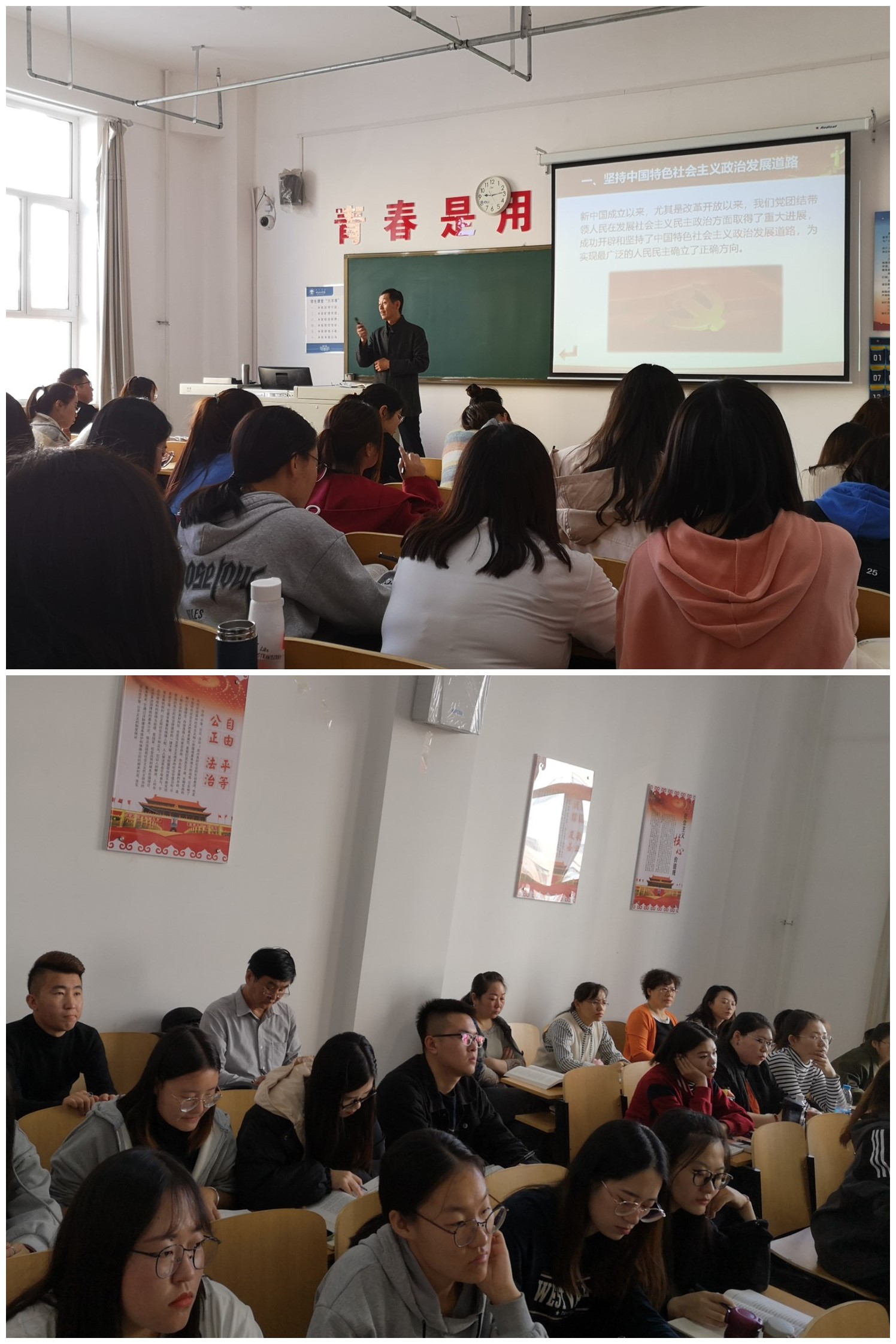 马庆林研究员作为学院校级优秀课程《中国特色社会主义理论体系概论》课程的负责人,几十年的从教经历和深厚的学识使其受到师生的广泛好评。本次授课条理清晰,紧扣时代最新理论资讯,重难点突出,课堂气氛活泼,师生互动卓有成效,为师生诠释了高水平的课堂设计。课后,思想政治教育系的老师针对马老师的授课进行了深入交流,对马老师的课程进行了高度评价,普遍认为本次活动对提高专业课教师的课堂教学水平起到了良好的推动作用。