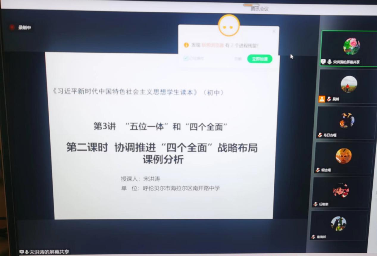 为学习贯彻落实习近平总书记在中国人民大学重要讲话精神,推进大中小学思政课一体化建设,进一步落实实践教学工作要求,提升思想政治教育专业师范生教学技能,万象城娱乐awc线路举行大中小学校《习近平新时代中国特色社会主义思想学生读本》示范课课例展示及研讨活动。5月13日下午,我院邀请南开路中学思政课教师宋洪涛为2019级、2020级全体同学做题为《协调推进“四个全面”战略布局课例分析》的线上讲座。本次会议由万象城娱乐awc线路实习实训中心主任吴娇主持。