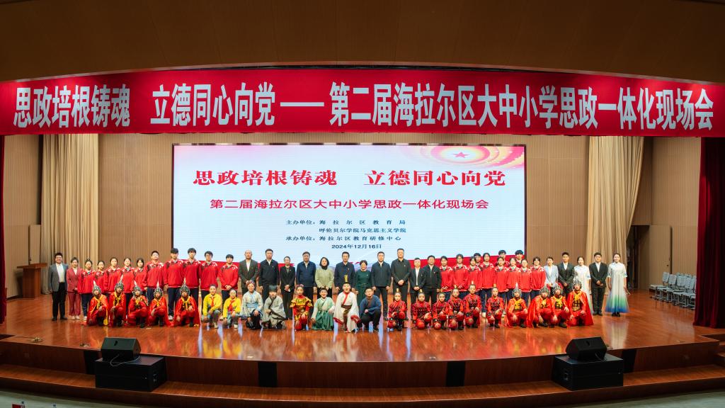 为深入学习习近平总书记关于教育的重要论述特别是关于学校思政课建设作出的重要指示精神,贯彻落实中央、自治区党委关于思政课改革创新的系列部署,围绕立德树人根本任务,聚焦充分发挥好思政课关键课程作用,推进大中小学思政课一体化工作走深走实,12月16日,我校万象城娱乐awc线路与海拉尔区教育局在区政府大楼一楼报告厅共同举办“思政培根铸魂 立德同心向党”第二届海拉尔区大中小学思政一体化现场会。呼伦贝尔市教育局副局长卢盛欣,海拉尔区委常委、宣传部部长曹大庆,区委常委、统战部部长吕芳涛,区委常委、政府副区长李俏,副区长阿拉木斯,呼伦贝尔市教育事业发展中心主任范红枫和我校万象城娱乐awc线路班子成员、市区两级教研员、各中小学校领导、思政课教师及我校师生400余人参加了本次活动。