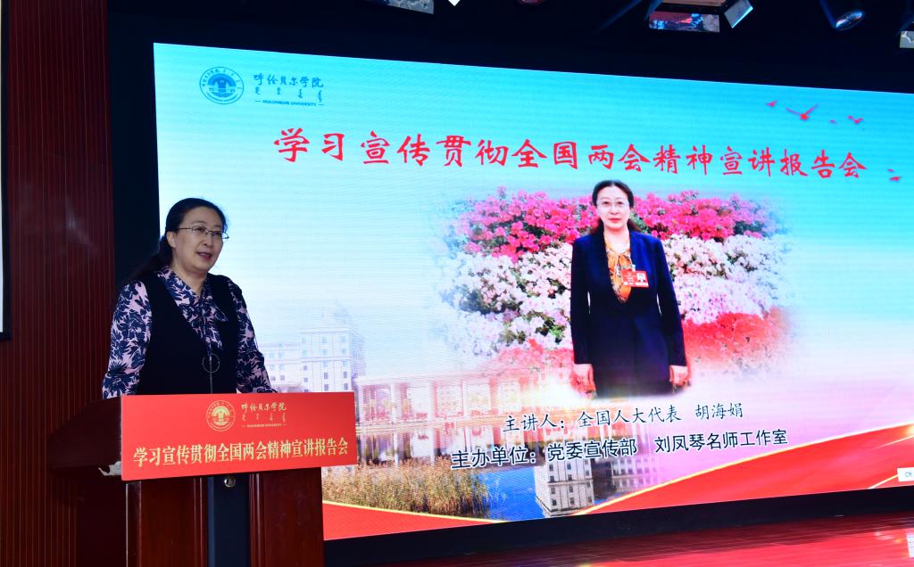 宣讲会上,胡海娟结合参会经历和履职实践,从十四届全国人大三次会议概况、习近平总书记在全国两会期间的重要讲话精神、大会各项报告的主要内容、会议期间内蒙古代表团活动情况以及本人的履职情况等五个方面进行了深入浅出的讲解,对我校学生深刻领会全国两会精神具有很强的指导意义。