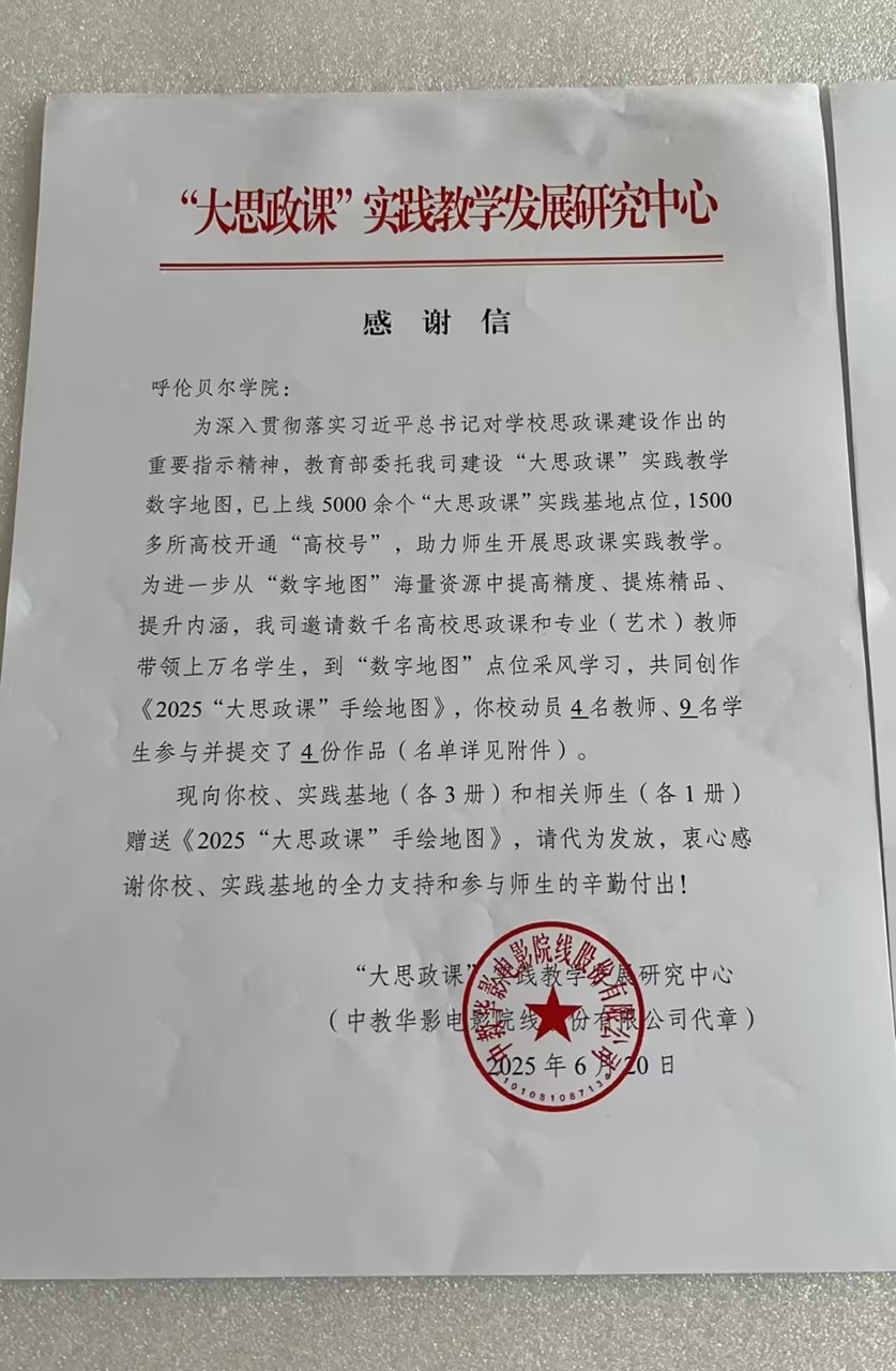 近日,我校收到了一封来自“大思政课”实践教学发展研究中心的感谢信,向我校万象城娱乐awc线路对教育部委托项目“大思政课”实践教学数字地图的全力支持以及参与师生的辛勤付出表示衷心感谢,并向学院、实践基地(各3册)和相关师生(各1册)赠送《2025“大思政课”手绘地图》。